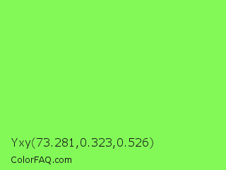 Yxy 73.281,0.323,0.526 Color is a light green color and the nearest color is Screamin Green #66ff66. Hex code #83f958 and RGB value is rgb(131,249,88). In RGB color space, this color is composed of 51% red, 98% green, 35% blue, In CMYK color space, this color is composed of 47% cyan, 0% magenta, 65% yellow , 2% black , In HSL color space, this color has a hue angle of 104° , 93% saturation and 66% lightness.
