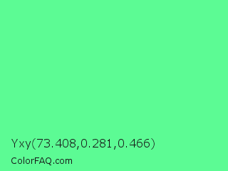 Yxy 73.408,0.281,0.466 Color is a light green color and the nearest color is Very Light Malachite Green #64e986. Hex code #5cfb94 and RGB value is rgb(92,251,148). In RGB color space, this color is composed of 36% red, 98% green, 58% blue, In CMYK color space, this color is composed of 63% cyan, 0% magenta, 41% yellow , 2% black , In HSL color space, this color has a hue angle of 141° , 95% saturation and 67% lightness.