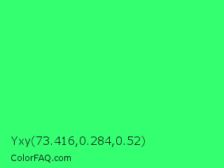 Yxy 73.416,0.284,0.52 Color is a normal green color and the nearest color is UFO Green #3cd070. Hex code #33ff71 and RGB value is rgb(51,255,113). In RGB color space, this color is composed of 20% red, 100% green, 44% blue, In CMYK color space, this color is composed of 80% cyan, 0% magenta, 56% yellow , 0% black , In HSL color space, this color has a hue angle of 138° , 100% saturation and 60% lightness.