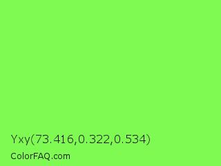 Yxy 73.416,0.322,0.534 Color is a light green color and the nearest color is Screamin Green #66ff66. Hex code #7efa52 and RGB value is rgb(126,250,82). In RGB color space, this color is composed of 49% red, 98% green, 32% blue, In CMYK color space, this color is composed of 50% cyan, 0% magenta, 67% yellow , 2% black , In HSL color space, this color has a hue angle of 104° , 94% saturation and 65% lightness.