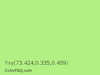 Yxy 73.424,0.335,0.459 Color is a light green color and the nearest color is Sulu #c1f07c. Hex code #b2f083 and RGB value is rgb(178,240,131). In RGB color space, this color is composed of 70% red, 94% green, 51% blue, In CMYK color space, this color is composed of 26% cyan, 0% magenta, 45% yellow , 6% black , In HSL color space, this color has a hue angle of 94° , 78% saturation and 73% lightness.