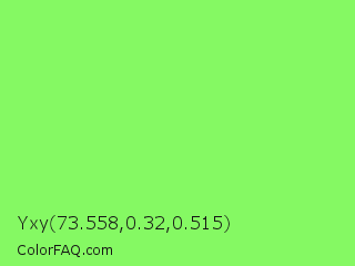 Yxy 73.558,0.32,0.515 Color is a light green color and the nearest color is Screamin Green #66ff66. Hex code #85f963 and RGB value is rgb(133,249,99). In RGB color space, this color is composed of 52% red, 98% green, 39% blue, In CMYK color space, this color is composed of 47% cyan, 0% magenta, 60% yellow , 2% black , In HSL color space, this color has a hue angle of 106° , 93% saturation and 68% lightness.