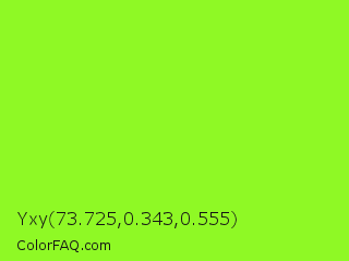 Yxy 73.725,0.343,0.555 Color is a normal green color and the nearest color is Spring Frost #87ff2a. Hex code #8ff925 and RGB value is rgb(143,249,37). In RGB color space, this color is composed of 56% red, 98% green, 15% blue, In CMYK color space, this color is composed of 43% cyan, 0% magenta, 85% yellow , 2% black , In HSL color space, this color has a hue angle of 90° , 95% saturation and 56% lightness.