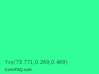 Yxy 73.771,0.269,0.469 Color is a normal green color and the nearest color is Eucalyptus #44d7a8. Hex code #32fe97 and RGB value is rgb(50,254,151). In RGB color space, this color is composed of 20% red, 100% green, 59% blue, In CMYK color space, this color is composed of 80% cyan, 0% magenta, 41% yellow , 0% black , In HSL color space, this color has a hue angle of 150° , 99% saturation and 60% lightness.