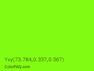 Yxy 73.784,0.337,0.567 Color is a normal green color and the nearest color is Chartreuse #7fff00. Hex code #82fb12 and RGB value is rgb(130,251,18). In RGB color space, this color is composed of 51% red, 98% green, 7% blue, In CMYK color space, this color is composed of 48% cyan, 0% magenta, 93% yellow , 2% black , In HSL color space, this color has a hue angle of 91° , 97% saturation and 53% lightness.