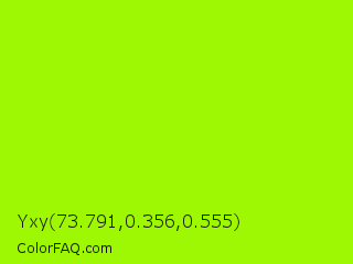 Yxy 73.791,0.356,0.555 Color is a normal green color and the nearest color is Spring Bud #a7fc00. Hex code #9ef703 and RGB value is rgb(158,247,3). In RGB color space, this color is composed of 62% red, 97% green, 1% blue, In CMYK color space, this color is composed of 36% cyan, 0% magenta, 99% yellow , 3% black , In HSL color space, this color has a hue angle of 82° , 98% saturation and 49% lightness.