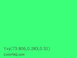 Yxy 73.806,0.283,0.51 Color is a light green color and the nearest color is Screamin Green #66ff66. Hex code #3bff78 and RGB value is rgb(59,255,120). In RGB color space, this color is composed of 23% red, 100% green, 47% blue, In CMYK color space, this color is composed of 77% cyan, 0% magenta, 53% yellow , 0% black , In HSL color space, this color has a hue angle of 139° , 100% saturation and 62% lightness.