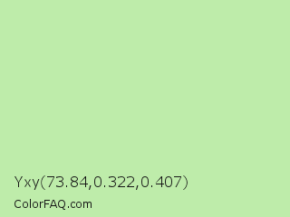 Yxy 73.84,0.322,0.407 Color is a light green color and the nearest color is Madang #b7f0be. Hex code #beecaa and RGB value is rgb(190,236,170). In RGB color space, this color is composed of 75% red, 93% green, 67% blue, In CMYK color space, this color is composed of 19% cyan, 0% magenta, 28% yellow , 7% black , In HSL color space, this color has a hue angle of 102° , 63% saturation and 80% lightness.