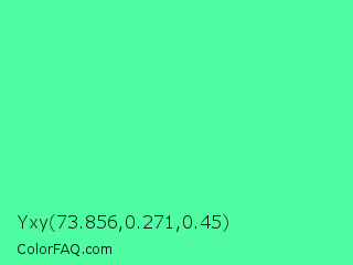 Yxy 73.856,0.271,0.45 Color is a light green color and the nearest color is Very Light Malachite Green #64e986. Hex code #4ffca1 and RGB value is rgb(79,252,161). In RGB color space, this color is composed of 31% red, 99% green, 63% blue, In CMYK color space, this color is composed of 69% cyan, 0% magenta, 36% yellow , 1% black , In HSL color space, this color has a hue angle of 148° , 97% saturation and 65% lightness.