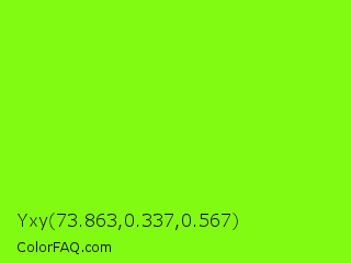Yxy 73.863,0.337,0.567 Color is a normal green color and the nearest color is Chartreuse #7fff00. Hex code #82fb12 and RGB value is rgb(130,251,18). In RGB color space, this color is composed of 51% red, 98% green, 7% blue, In CMYK color space, this color is composed of 48% cyan, 0% magenta, 93% yellow , 2% black , In HSL color space, this color has a hue angle of 91° , 97% saturation and 53% lightness.