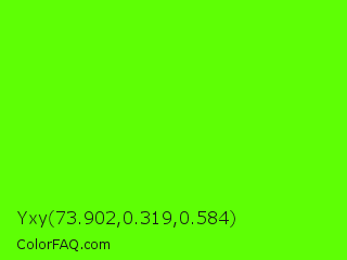 Yxy 73.902,0.319,0.584 Color is a normal green color and the nearest color is Bright Green #66ff00. Hex code #5eff05 and RGB value is rgb(94,255,5). In RGB color space, this color is composed of 37% red, 100% green, 2% blue, In CMYK color space, this color is composed of 63% cyan, 0% magenta, 98% yellow , 0% black , In HSL color space, this color has a hue angle of 99° , 100% saturation and 51% lightness.