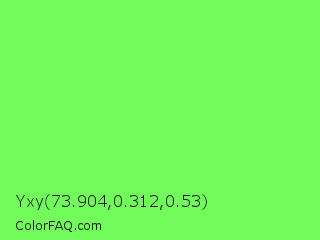 Yxy 73.904,0.312,0.53 Color is a light green color and the nearest color is Screamin Green #66ff66. Hex code #71fc5c and RGB value is rgb(113,252,92). In RGB color space, this color is composed of 44% red, 99% green, 36% blue, In CMYK color space, this color is composed of 55% cyan, 0% magenta, 63% yellow , 1% black , In HSL color space, this color has a hue angle of 112° , 96% saturation and 67% lightness.