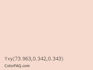Yxy 73.963,0.342,0.343 Color is a very light orange color and the nearest color is Champagne Pink #f1ddcf. Hex code #f5dacd and RGB value is rgb(245,218,205). In RGB color space, this color is composed of 96% red, 85% green, 80% blue, In CMYK color space, this color is composed of 0% cyan, 11% magenta, 16% yellow , 4% black , In HSL color space, this color has a hue angle of 20° , 67% saturation and 88% lightness.