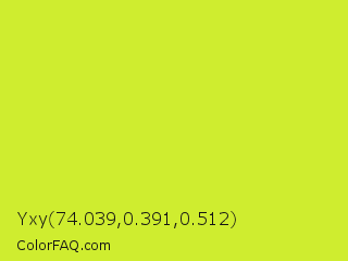 Yxy 74.039,0.391,0.512 Color is a normal yellow color and the nearest color is Pear #d1e231. Hex code #cfed2f and RGB value is rgb(207,237,47). In RGB color space, this color is composed of 81% red, 93% green, 18% blue, In CMYK color space, this color is composed of 13% cyan, 0% magenta, 80% yellow , 7% black , In HSL color space, this color has a hue angle of 69° , 84% saturation and 56% lightness.