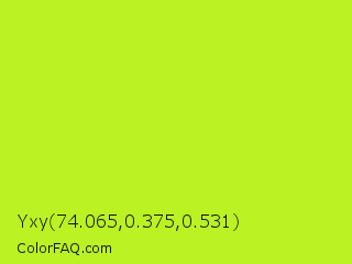 Yxy 74.065,0.375,0.531 Color is a normal lime color and the nearest color is Green Yellow #adff2f. Hex code #baf223 and RGB value is rgb(186,242,35). In RGB color space, this color is composed of 73% red, 95% green, 14% blue, In CMYK color space, this color is composed of 23% cyan, 0% magenta, 86% yellow , 5% black , In HSL color space, this color has a hue angle of 76° , 89% saturation and 54% lightness.