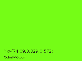 Yxy 74.09,0.329,0.572 Color is a normal green color and the nearest color is Lawn Green #7cfc00. Hex code #75fd16 and RGB value is rgb(117,253,22). In RGB color space, this color is composed of 46% red, 99% green, 9% blue, In CMYK color space, this color is composed of 54% cyan, 0% magenta, 91% yellow , 1% black , In HSL color space, this color has a hue angle of 95° , 98% saturation and 54% lightness.
