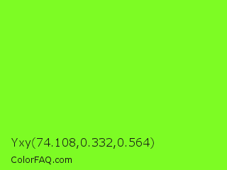 Yxy 74.108,0.332,0.564 Color is a normal green color and the nearest color is Spring Frost #87ff2a. Hex code #7dfc24 and RGB value is rgb(125,252,36). In RGB color space, this color is composed of 49% red, 99% green, 14% blue, In CMYK color space, this color is composed of 50% cyan, 0% magenta, 86% yellow , 1% black , In HSL color space, this color has a hue angle of 95° , 97% saturation and 56% lightness.