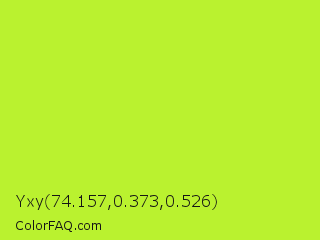 Yxy 74.157,0.373,0.526 Color is a normal lime color and the nearest color is Green Yellow #adff2f. Hex code #baf22f and RGB value is rgb(186,242,47). In RGB color space, this color is composed of 73% red, 95% green, 18% blue, In CMYK color space, this color is composed of 23% cyan, 0% magenta, 81% yellow , 5% black , In HSL color space, this color has a hue angle of 77° , 88% saturation and 57% lightness.