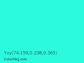 Yxy 74.159,0.238,0.365 Color is a normal cyan color and the nearest color is Turquoise #40e0d0. Hex code #2cfade and RGB value is rgb(44,250,222). In RGB color space, this color is composed of 17% red, 98% green, 87% blue, In CMYK color space, this color is composed of 82% cyan, 0% magenta, 11% yellow , 2% black , In HSL color space, this color has a hue angle of 172° , 95% saturation and 58% lightness.