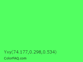 Yxy 74.177,0.298,0.534 Color is a light green color and the nearest color is Screamin Green #66ff66. Hex code #52ff61 and RGB value is rgb(82,255,97). In RGB color space, this color is composed of 32% red, 100% green, 38% blue, In CMYK color space, this color is composed of 68% cyan, 0% magenta, 62% yellow , 0% black , In HSL color space, this color has a hue angle of 125° , 100% saturation and 66% lightness.
