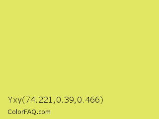 Yxy 74.221,0.39,0.466 Color is a light yellow color and the nearest color is Booger Buster #dde26a. Hex code #e2e763 and RGB value is rgb(226,231,99). In RGB color space, this color is composed of 89% red, 91% green, 39% blue, In CMYK color space, this color is composed of 2% cyan, 0% magenta, 57% yellow , 9% black , In HSL color space, this color has a hue angle of 62° , 73% saturation and 65% lightness.