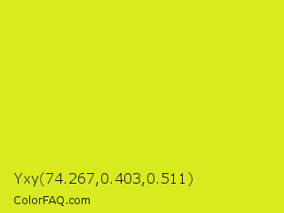 Yxy 74.267,0.403,0.511 Color is a normal yellow color and the nearest color is Piss Yellow #e1e115. Hex code #d9eb1e and RGB value is rgb(217,235,30). In RGB color space, this color is composed of 85% red, 92% green, 12% blue, In CMYK color space, this color is composed of 8% cyan, 0% magenta, 87% yellow , 8% black , In HSL color space, this color has a hue angle of 65° , 84% saturation and 52% lightness.