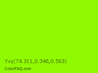 Yxy 74.311,0.346,0.563 Color is a normal green color and the nearest color is Chartreuse #7fff00. Hex code #90fa03 and RGB value is rgb(144,250,3). In RGB color space, this color is composed of 56% red, 98% green, 1% blue, In CMYK color space, this color is composed of 42% cyan, 0% magenta, 99% yellow , 2% black , In HSL color space, this color has a hue angle of 86° , 98% saturation and 50% lightness.