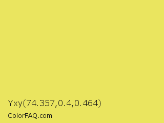 Yxy 74.357,0.4,0.464 Color is a light yellow color and the nearest color is Confetti #e9d75a. Hex code #eae55f and RGB value is rgb(234,229,95). In RGB color space, this color is composed of 92% red, 90% green, 37% blue, In CMYK color space, this color is composed of 0% cyan, 2% magenta, 59% yellow , 8% black , In HSL color space, this color has a hue angle of 58° , 77% saturation and 65% lightness.