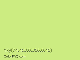 Yxy 74.413,0.356,0.45 Color is a light lime color and the nearest color is Sulu #c1f07c. Hex code #ccec81 and RGB value is rgb(204,236,129). In RGB color space, this color is composed of 80% red, 93% green, 51% blue, In CMYK color space, this color is composed of 14% cyan, 0% magenta, 45% yellow , 7% black , In HSL color space, this color has a hue angle of 78° , 74% saturation and 72% lightness.
