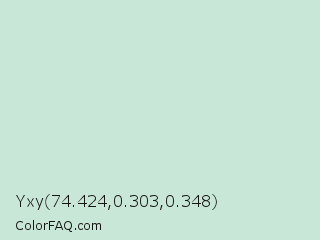 Yxy 74.424,0.303,0.348 Color is a very light green color and the nearest color is Skeptic #cae6da. Hex code #c9e7d6 and RGB value is rgb(201,231,214). In RGB color space, this color is composed of 79% red, 91% green, 84% blue, In CMYK color space, this color is composed of 13% cyan, 0% magenta, 7% yellow , 9% black , In HSL color space, this color has a hue angle of 146° , 38% saturation and 85% lightness.