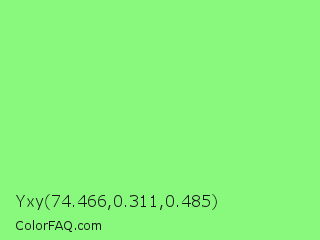 Yxy 74.466,0.311,0.485 Color is a light green color and the nearest color is Light Green #90ee90. Hex code #88f97d and RGB value is rgb(136,249,125). In RGB color space, this color is composed of 53% red, 98% green, 49% blue, In CMYK color space, this color is composed of 45% cyan, 0% magenta, 50% yellow , 2% black , In HSL color space, this color has a hue angle of 115° , 91% saturation and 73% lightness.