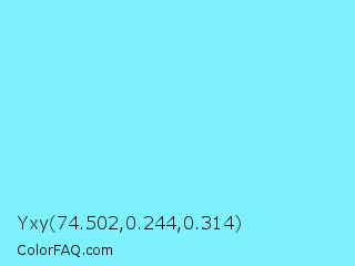 Yxy 74.502,0.244,0.314 Color is a light cyan color and the nearest color is Electric Blue #7df9ff. Hex code #7ef1fe and RGB value is rgb(126,241,254). In RGB color space, this color is composed of 49% red, 95% green, 100% blue, In CMYK color space, this color is composed of 50% cyan, 5% magenta, 0% yellow , 0% black , In HSL color space, this color has a hue angle of 186° , 98% saturation and 75% lightness.