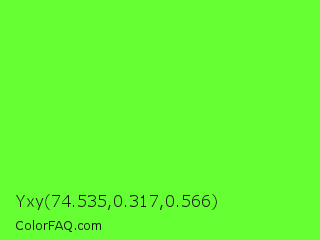 Yxy 74.535,0.317,0.566 Color is a normal green color and the nearest color is Spring Frost #87ff2a. Hex code #65ff34 and RGB value is rgb(101,255,52). In RGB color space, this color is composed of 40% red, 100% green, 20% blue, In CMYK color space, this color is composed of 60% cyan, 0% magenta, 80% yellow , 0% black , In HSL color space, this color has a hue angle of 106° , 100% saturation and 60% lightness.