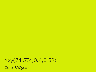 Yxy 74.574,0.4,0.52 Color is a normal yellow color and the nearest color is Bitter Lemon #cae00d. Hex code #d4ed04 and RGB value is rgb(212,237,4). In RGB color space, this color is composed of 83% red, 93% green, 2% blue, In CMYK color space, this color is composed of 11% cyan, 0% magenta, 98% yellow , 7% black , In HSL color space, this color has a hue angle of 66° , 97% saturation and 47% lightness.