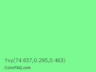 Yxy 74.657,0.295,0.463 Color is a light green color and the nearest color is Light Green #90ee90. Hex code #7bfa92 and RGB value is rgb(123,250,146). In RGB color space, this color is composed of 48% red, 98% green, 57% blue, In CMYK color space, this color is composed of 51% cyan, 0% magenta, 42% yellow , 2% black , In HSL color space, this color has a hue angle of 131° , 93% saturation and 73% lightness.