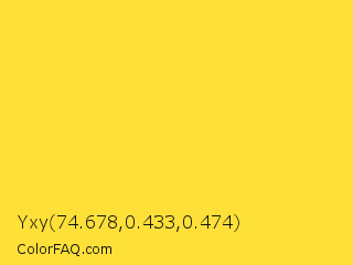 Yxy 74.678,0.433,0.474 Color is a light yellow color and the nearest color is Banana Yellow #ffe135. Hex code #fee039 and RGB value is rgb(254,224,57). In RGB color space, this color is composed of 100% red, 88% green, 22% blue, In CMYK color space, this color is composed of 0% cyan, 12% magenta, 78% yellow , 0% black , In HSL color space, this color has a hue angle of 51° , 99% saturation and 61% lightness.