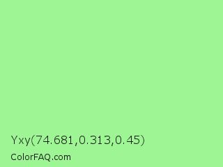 Yxy 74.681,0.313,0.45 Color is a light green color and the nearest color is Pale Green #98fb98. Hex code #9df593 and RGB value is rgb(157,245,147). In RGB color space, this color is composed of 62% red, 96% green, 58% blue, In CMYK color space, this color is composed of 36% cyan, 0% magenta, 40% yellow , 4% black , In HSL color space, this color has a hue angle of 114° , 83% saturation and 77% lightness.