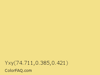 Yxy 74.711,0.385,0.421 Color is a light yellow color and the nearest color is Sahara Sand #f1e788. Hex code #f3e189 and RGB value is rgb(243,225,137). In RGB color space, this color is composed of 95% red, 88% green, 54% blue, In CMYK color space, this color is composed of 0% cyan, 7% magenta, 44% yellow , 5% black , In HSL color space, this color has a hue angle of 50° , 82% saturation and 75% lightness.