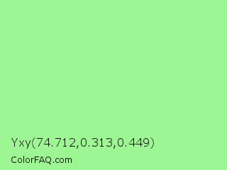 Yxy 74.712,0.313,0.449 Color is a light green color and the nearest color is Pale Green #98fb98. Hex code #9ef594 and RGB value is rgb(158,245,148). In RGB color space, this color is composed of 62% red, 96% green, 58% blue, In CMYK color space, this color is composed of 36% cyan, 0% magenta, 40% yellow , 4% black , In HSL color space, this color has a hue angle of 114° , 83% saturation and 77% lightness.
