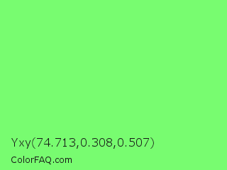 Yxy 74.713,0.308,0.507 Color is a light green color and the nearest color is Screamin Green #66ff66. Hex code #78fc70 and RGB value is rgb(120,252,112). In RGB color space, this color is composed of 47% red, 99% green, 44% blue, In CMYK color space, this color is composed of 52% cyan, 0% magenta, 56% yellow , 1% black , In HSL color space, this color has a hue angle of 117° , 96% saturation and 71% lightness.