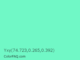 Yxy 74.723,0.265,0.392 Color is a light green color and the nearest color is Aquamarine #7fffd4. Hex code #70f8c6 and RGB value is rgb(112,248,198). In RGB color space, this color is composed of 44% red, 97% green, 78% blue, In CMYK color space, this color is composed of 55% cyan, 0% magenta, 20% yellow , 3% black , In HSL color space, this color has a hue angle of 158° , 91% saturation and 71% lightness.
