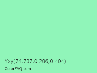 Yxy 74.737,0.286,0.404 Color is a light green color and the nearest color is Teal Deer #99e6b3. Hex code #90f5b9 and RGB value is rgb(144,245,185). In RGB color space, this color is composed of 56% red, 96% green, 73% blue, In CMYK color space, this color is composed of 41% cyan, 0% magenta, 24% yellow , 4% black , In HSL color space, this color has a hue angle of 144° , 83% saturation and 76% lightness.