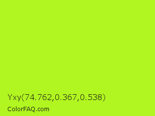 Yxy 74.762,0.367,0.538 Color is a normal lime color and the nearest color is Green Yellow #adff2f. Hex code #b1f521 and RGB value is rgb(177,245,33). In RGB color space, this color is composed of 69% red, 96% green, 13% blue, In CMYK color space, this color is composed of 28% cyan, 0% magenta, 87% yellow , 4% black , In HSL color space, this color has a hue angle of 79° , 91% saturation and 55% lightness.
