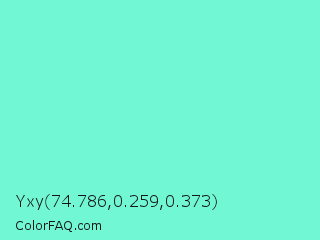 Yxy 74.786,0.259,0.373 Color is a light cyan color and the nearest color is Aquamarine #7fffd4. Hex code #71f7d4 and RGB value is rgb(113,247,212). In RGB color space, this color is composed of 44% red, 97% green, 83% blue, In CMYK color space, this color is composed of 54% cyan, 0% magenta, 14% yellow , 3% black , In HSL color space, this color has a hue angle of 164° , 89% saturation and 71% lightness.