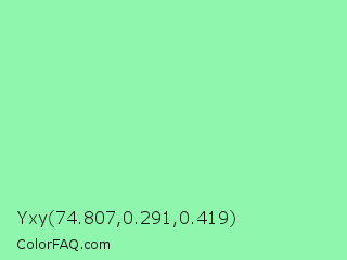 Yxy 74.807,0.291,0.419 Color is a light green color and the nearest color is Teal Deer #99e6b3. Hex code #8ff6ae and RGB value is rgb(143,246,174). In RGB color space, this color is composed of 56% red, 96% green, 68% blue, In CMYK color space, this color is composed of 42% cyan, 0% magenta, 29% yellow , 4% black , In HSL color space, this color has a hue angle of 138° , 85% saturation and 76% lightness.