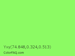 Yxy 74.848,0.324,0.513 Color is a light green color and the nearest color is Screamin Green #66ff66. Hex code #8cfa63 and RGB value is rgb(140,250,99). In RGB color space, this color is composed of 55% red, 98% green, 39% blue, In CMYK color space, this color is composed of 44% cyan, 0% magenta, 60% yellow , 2% black , In HSL color space, this color has a hue angle of 104° , 94% saturation and 68% lightness.