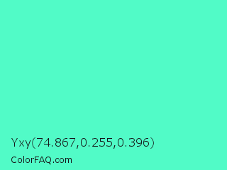 Yxy 74.867,0.255,0.396 Color is a light green color and the nearest color is Turquoise #40e0d0. Hex code #51fbc7 and RGB value is rgb(81,251,199). In RGB color space, this color is composed of 32% red, 98% green, 78% blue, In CMYK color space, this color is composed of 68% cyan, 0% magenta, 21% yellow , 2% black , In HSL color space, this color has a hue angle of 162° , 96% saturation and 65% lightness.