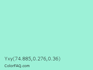 Yxy 74.885,0.276,0.36 Color is a light green color and the nearest color is Water Leaf #a1e9de. Hex code #9cf1d7 and RGB value is rgb(156,241,215). In RGB color space, this color is composed of 61% red, 95% green, 84% blue, In CMYK color space, this color is composed of 35% cyan, 0% magenta, 11% yellow , 5% black , In HSL color space, this color has a hue angle of 162° , 75% saturation and 78% lightness.