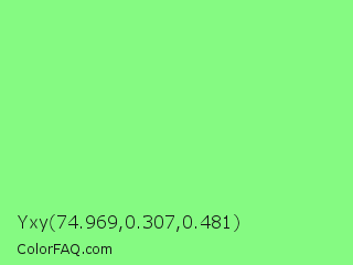 Yxy 74.969,0.307,0.481 Color is a light green color and the nearest color is Light Green #90ee90. Hex code #85fa82 and RGB value is rgb(133,250,130). In RGB color space, this color is composed of 52% red, 98% green, 51% blue, In CMYK color space, this color is composed of 47% cyan, 0% magenta, 48% yellow , 2% black , In HSL color space, this color has a hue angle of 119° , 92% saturation and 75% lightness.