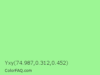 Yxy 74.987,0.312,0.452 Color is a light green color and the nearest color is Pale Green #98fb98. Hex code #9bf693 and RGB value is rgb(155,246,147). In RGB color space, this color is composed of 61% red, 96% green, 58% blue, In CMYK color space, this color is composed of 37% cyan, 0% magenta, 40% yellow , 4% black , In HSL color space, this color has a hue angle of 115° , 85% saturation and 77% lightness.